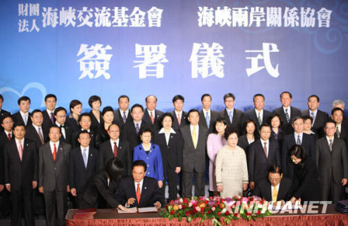 这是海协会会长陈云林(前左)与海基会董事长江丙坤在签署协议。
