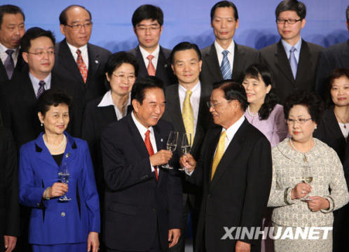 这是海协会会长陈云林(前左二)与海基会董事长江丙坤相互敬酒祝贺。新华社记者 袁满 摄