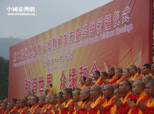 中国台湾网11月24日无锡消息 昨天上午,第二届世界佛教论坛新闻发布暨鸣钟祈福仪式在无锡灵山举行。中国佛教协会会长一诚长老、国际佛光会总会长星云大师、香港佛教联合会会长觉光长老于同一时刻分别在无锡、高雄、香港三地敲响祈福钟声。带着两岸三地佛教界对世界和平、社会和谐、两岸和睦的美好祝愿,庄严深沉的钟声远扬。