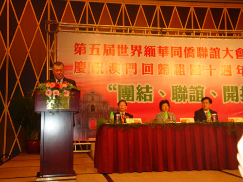 4月24日至27日,由澳门缅华互助会主办,以“团结、联谊、开拓、发展”为主题的“第五届世界缅华同侨联谊大会庆祝澳门回归祖国十周年暨第十四届澳门缅华泼水节系列活动”在澳门成功举办。澳门特别行政区行政长官何厚铧、中央政府驻澳门联络办公室副主任徐泽、外交部驻澳门副特派员宋彦斌、中华全国归国华侨联合会副主任李祖沛及广东、江西、深圳等省市侨办负责同志出席大会。受李海峰主任委托,国侨办国外司司长吴洪芹代表我办应邀参加大会并在开幕式上致辞。