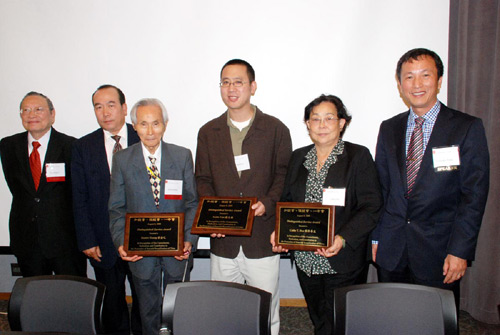 “论坛”主办组织向优秀和统人士颁奖。右起:大芝加哥地区和统会会长王永高、获奖者徐泰生、蔡文珠、黄企之、统促会会长梁元钧、一中会会长李志钟。(张大卫/摄)