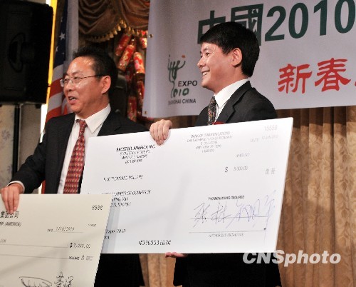 当地时间1月16日晚,纽约华人华侨隆重举行以欢庆中国2010年上海世博会为主题的新春联欢会,以中国政协常委、原上海市常务副市长蒋以任为首的上海代表团出席了联欢会。图为出席联欢会的华人社团、商家团体及个人、在纽约的中资企业纷纷捐款,以实际行动支持世界博览会在中国举办。 中新社发 龚文谟 摄