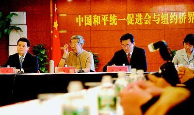 全国人大常委会前副委员长、中国和平统一促进会副会长许嘉璐(图左二),22日率团在中国驻纽约总领事馆与侨界人士座谈,他表示台海两岸当前的可喜形势,海外华人社团功不可没。 (记者曹健摄)