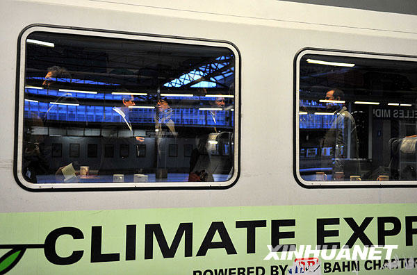 12月5日,在比利时布鲁塞尔火车站,“气候快车”准备出发。这列“气候快车”当天从这里出发,途中停靠德国科隆和汉堡,最终抵达丹麦的哥本哈根。这列蓝色和绿色涂装的火车上载有400多人,包括联合国气候变化大会的与会代表、联合国官员、环保人士和记者等。此次活动由国际铁路联盟、联合国环境规划署、世界自然基金会等组织共同发起,意在唤起人们关注公共交通给气候带来的影响和宣传乘坐火车的环保益处。新华社记者徐速绘摄