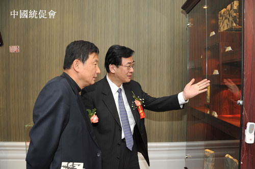 中国和平统一促进会执行副秘书长李路(右)和副秘书长王安南(左)参观展览