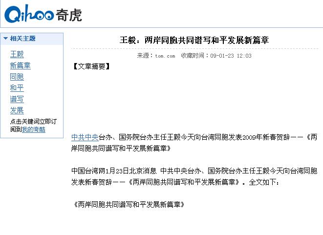 中共中央台办、国务院台办主任王毅今天向台湾同胞发表2009年新春贺辞――《两岸同胞共同谱写和平发展新篇章》