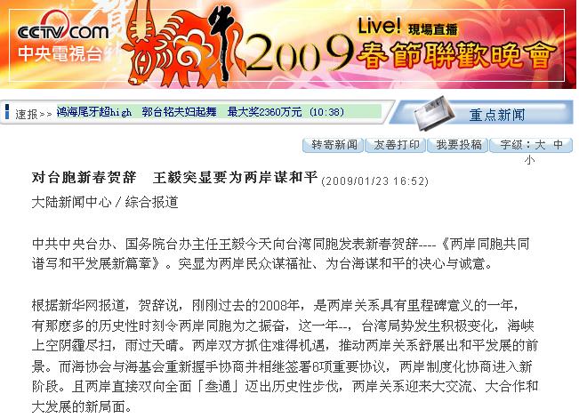 贺辞突显,展望2009年,中共中央台办、国务院台办将坚定不移地坚持中央对台大政方针,全面贯彻落实胡锦涛总书记重要讲话精神,牢牢把握两岸关系和平发展的主题,不断开创两岸关系和平发展的新局面。且真诚希望,两岸双方加强善意沟通,不断积累共识,保持良性交互的势头,进一步促进两岸关系改善和发展。