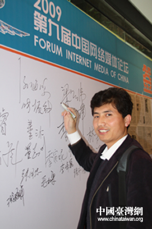 第九届中国网络媒体论坛将于明天开幕,图为参会嘉宾在签名版前签名留念。(中国台湾网 陈宁 摄)