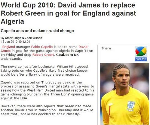 网易体育6月18日报道:英国媒体Goal.com透露,卡佩罗已经决定在英格兰对阿尔及利亚的比赛中用老将詹姆斯顶替首战犯下低级错误的格林担任首发门将。
