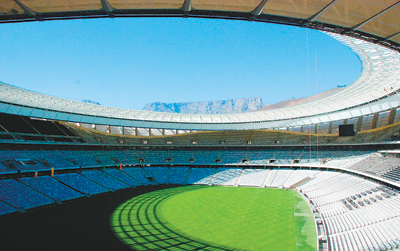 世界杯球场——开普敦绿点球场,远处是开普敦著名景点桌山山顶。本报驻南非记者 裴广江摄
