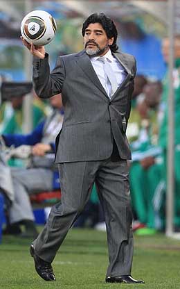 马拉多纳非常少见地身穿正装出席比赛。熟悉马拉多纳的人知道,这位狂放不羁的足球天才更喜欢身穿运动服。但是,时间飞逝,马拉多纳已经接受了新的角色——阿根廷国家队的主教练。马拉多纳以这样一种从未有过的方式向全世界宣告:世界杯,马拉多纳回来了!