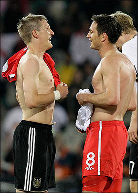 之后,施魏因斯泰格就赤裸着上身冲向了看台上的女友,并将兰帕德的球衣给了她,于是赛后人们看到了“小猪”女友穿着英格兰红色8号的奇怪一幕。不过,据说周围的德国球迷为这一幕大声鼓掌叫好。