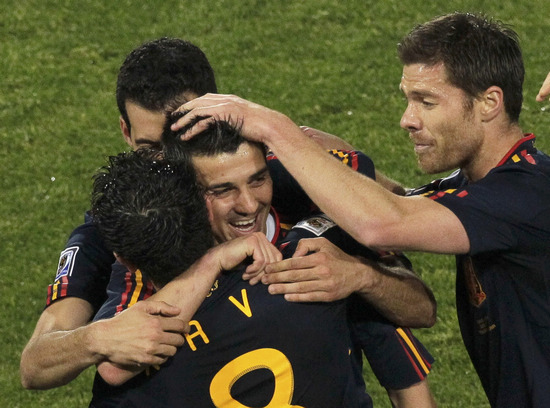西班牙第24分钟取得领先,阿隆索直传左路,布拉沃出击抢在托雷斯之前铲球解围,比利亚40码外直接射空门入网,这是他近2场比赛的第3粒入球。第27分钟,埃斯特拉达禁区前铲倒伊涅斯塔险些得到第2张黄牌,比利亚30码处任意球直接打飞。随后桑切斯和伊斯拉在禁区前的劲射均被西班牙后卫封堵。第34分钟,哈维开出角球,皮克9码处头球攻门高出。
