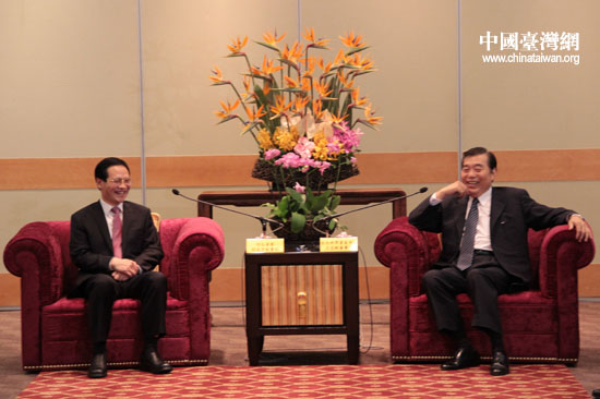 6月23日下午,台北世贸中心董事长王志刚在台北会见河北省委副书记付志方一行,双方进行了亲切友好的交谈。(摄影 中国台湾网 陈宁)