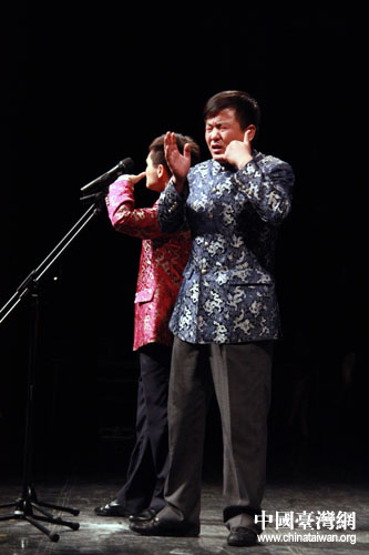 5月17日晚上,嘉义县表演艺术中心迎来了“第十一届京味文化——台湾嘉义亲情之旅”一行的表演艺术家、工艺美术大师们。应宁、王磊表演的《双簧》,何云伟、李菁带来的《学哑语》,李伟建、武宾经典段子《咨询热线》,以及由台北曲艺团带来的快板《双锁山》,相声《地理图之阿宝要脱团》,让当晚嘉义县表演艺术中心的观众从头笑到尾。(记者 董洁 图/文)