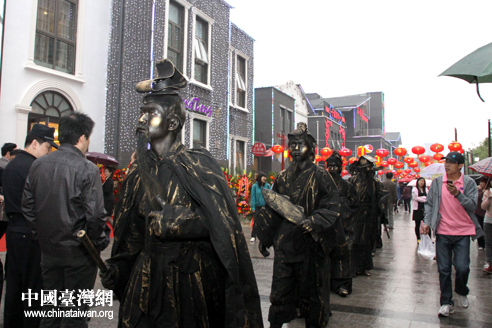 为期17天的“2011北京台湾文化艺术节”将推出系列展演活动,图为涂绘成秦朝将士的演员在北京台湾街行进,吸引了众多路人眼球。(中国台湾网 普燕 摄)