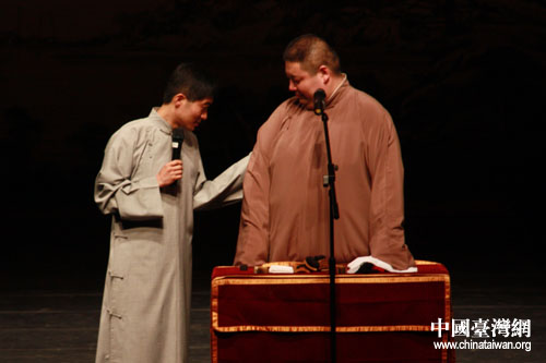 中国台湾网5月18日嘉义消息 5月17日晚上,嘉义县表演艺术中心迎来了“第十一届京味文化——台湾嘉义亲情之旅”一行的表演艺术家、工艺美术大师们。应宁、王磊表演的《双簧》,何云伟、李菁带来的《学哑语》,李伟建、武宾经典段子《咨询热线》,以及由台北曲艺团带来的快板《双锁山》,相声《地理图之阿宝要脱团》,让当晚嘉义县表演艺术中心的观众从头笑到尾。(记者 董洁 图/文)