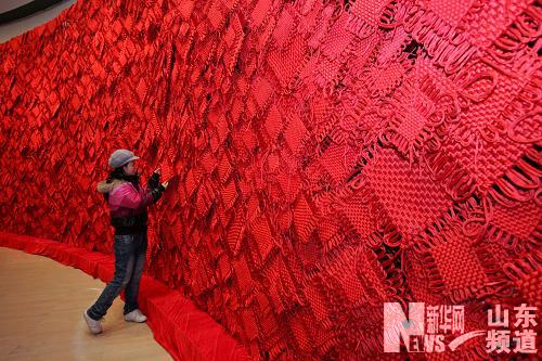 1月9日,参观者在欣赏由中国结组成的红墙。当日,《手艺农村——山东农村文化产业调研成果展》在中国美术馆开幕。展览通过文献资料、实物展示、艺人演示等形式,展示了山东潍坊风筝、临沂柳编、红花乡中国结、曹县桐杨木艺、鄄城土布、巨野农民工笔绘画等丰富的民间手艺。新华社发(赵冰 摄)