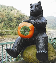 乌石部落的新图腾黑熊抱着特产柿子。(记者赵惠群/摄影)