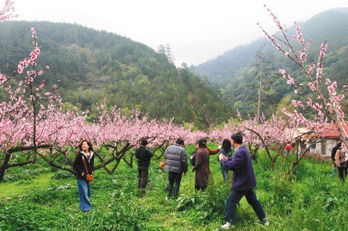 台中县武陵农场水蜜桃花盛开,满园粉红映山峦,引来游客嬉游,花期可至4月底,依照今年花季盛况,7、8月肯定水蜜桃会盛产。