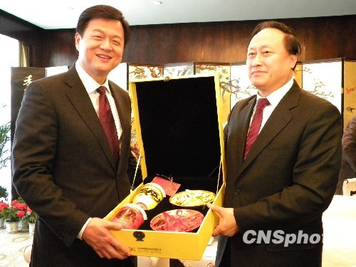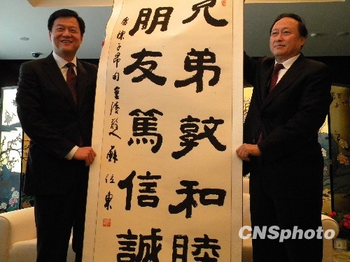 十二月二十六日,中共南京市委书记朱善璐在南京紫金山庄会见台北县县长周锡玮所率的台北县参访团一行。会间,朱善璐向台北县访问团赠送题有“兄弟敦和睦,朋友笃信诚”的墨宝和高淳陶瓷,而周锡玮回赠了台湾著名的瓷器精品。中新社发 朱晓颖 摄