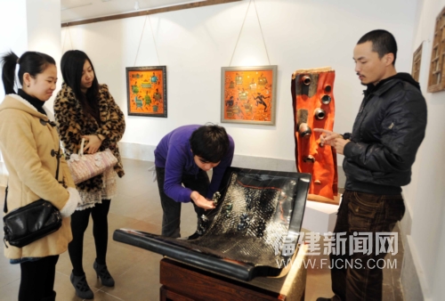 1月4日,近百件朴实典雅、深沉蕴蓄,文人韵味浓郁且出自闽台艺术家之手的漆艺、寿山石雕精品,亮相在福州举行的《中国漆与寿山石》主题艺术展 ,吸引不少年轻观众的目光。列入第一批国家级非物质文化遗产名录的漆艺和寿山石雕,是福州非物质文化遗产的代表性门类。(记者 刘可耕 摄)