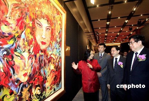 二月十一日,“中国国粹油画艺术精品展”在香港展览中心拉开帷幕,中央政府驻港联络办主任高祀仁等出席开幕式。中新社发 张勤 摄