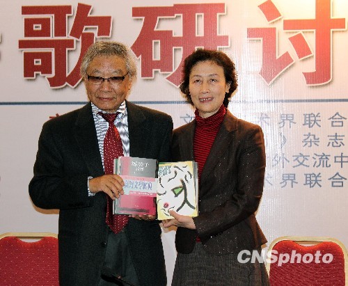 12月12日,“二00九海峡诗会”在福州举办,台湾著名诗人郑愁予(图左)跨海而来,与来自美国、澳大利亚、中国内地及香港、台湾的近百位诗歌界、学术界人士,就华语新诗诗学的创作理论、中国传统文化与现代诗的融合等课题进行深入探讨。(中新社 张丽君 摄)