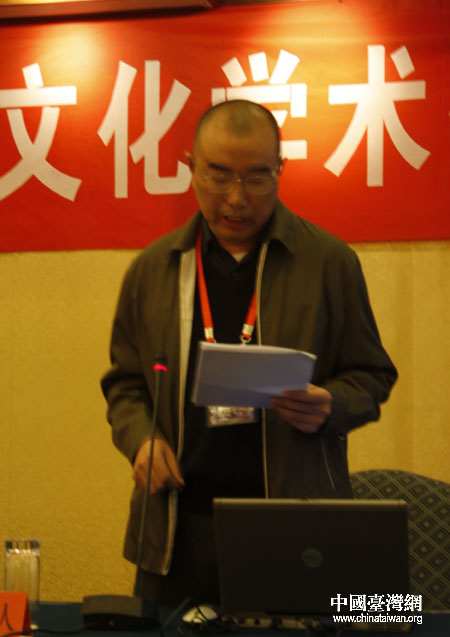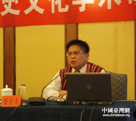 12月23日上午,台湾少数民族历史文化学术研讨会在北京举行,台湾少数民族教授协会理事长蔡中涵主持发言。(中国台湾网 徐丽华 摄)