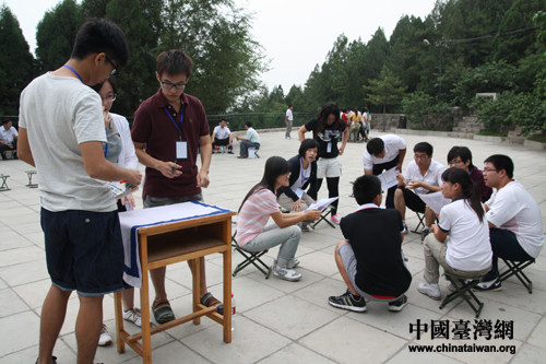 中国台湾网8月18日太原消息 18日上午,台湾青年交流团一行来到了位于山西太原的中北大学,和这所高校的青年学生开展交流活动。没有座谈会式的相互介绍,没有导游式的校园介绍,一项考验团队协作、沟通、互动的拓展训练使两岸青年在比赛中相识,在协作中相知,在胜利时相拥。