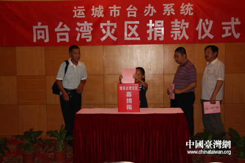 运城市台办主任董泽民在捐款活动上表示,自从8月8日台风“莫拉克”侵袭台湾中南部地区以来,运城市各界群众纷纷通过电话、书信等方式向台办部门了解受灾地区情况,咨询捐款事宜。今天借此机会我们带来了全市人民的爱心、诚心,希望通过大家的共同努力帮助灾区同胞渡过难关。