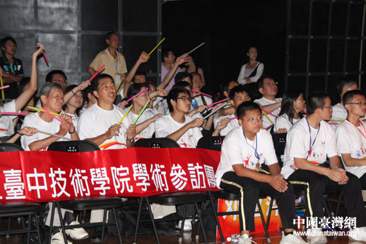 台中技术学院的同学们面带微笑,摇动着荧光棒,不时卖力地鼓掌。(中国台湾网 钟宝华 摄 )