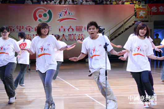 中国台湾网7月15日北京消息  昨晚,“青春牵两岸,十年大聚首——京台青少年交流周”暨两岸青年大联欢活动在北京大学生体育馆隆重举行。来自台湾大学、台中技术学院、屏东商业技术学院、基隆市二信中学、嘉义东石学校、新竹中信学校和国民党青年发展基金会、台湾工艺发展协会、周文镜文教基金会、台中中小企业协会等社会团体组织的600余名台湾师生与北京师生欢聚在一起,度过了难忘的一晚。