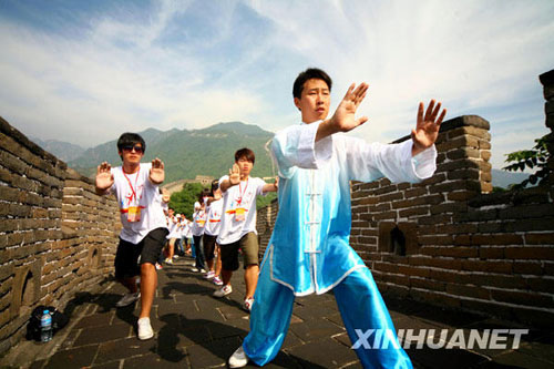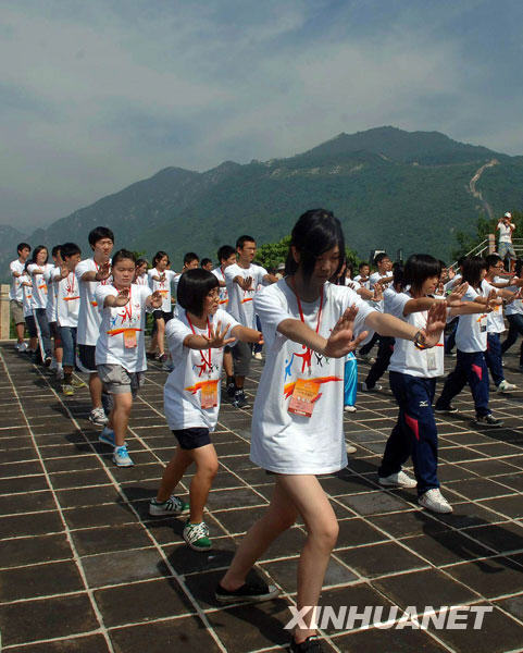 7月15日,参加“两岸青年舞太极聚长城”活动的学生在长城上学练太极。新华社发(卜向东 摄) |