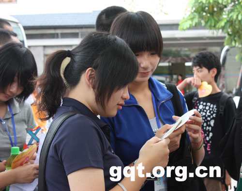 刚刚交换过结对卡的漳州三中的庄周洁(左)和台湾华侨高中的吴欣洁正在互相介绍自己。中国共青团网记者悦丹摄影