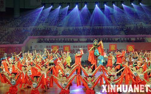 7月19日,比赛开始前演员们表演漳州民俗歌舞。当日,第四届海峡两岸青少年排球邀请赛在漳州举行。福建女子排球队以3比0战胜台湾华侨高中女子排球队。新华社记者沈汝发摄
