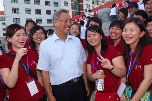 7月4日,台湾大学的学生与厦门大学教授张铭清(前左二)合影留念。新华社发(黄少毅 摄)
