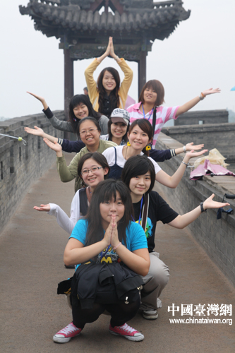 台湾青年的美女们在王家大院红门堡的龙脊上演绎出的千手观音(中国台湾网 陈宁 摄)