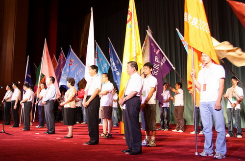 中央统战部副部长尤兰田授“龙脉相传,青春中华”“全国台联2009年台胞青年千人夏令营”总营旗。(中国台湾网 芮文辉 摄)