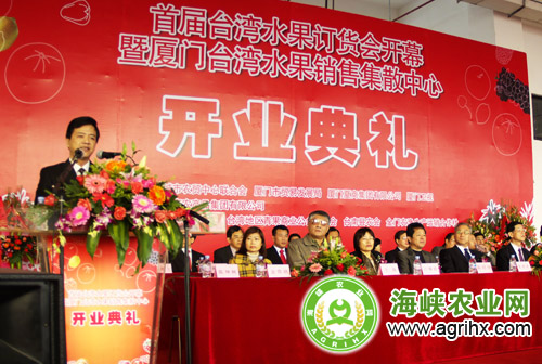 厦门市委副书记陈炳发(右一)、海峡两岸关系协会副会长张铭清(中)、商务部驻福州特办特派员曹宏瑛共同为启动首届台湾水果订货会