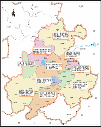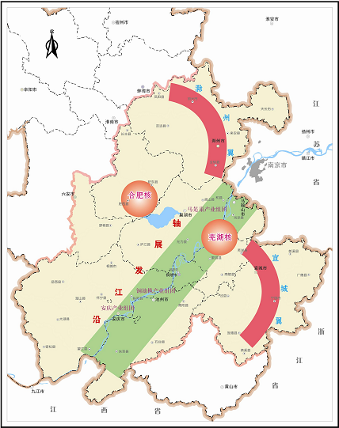 3、产业布局。皖江城市带将构建“一轴双核两翼”的产业空间格局,“一轴”包括安庆、池州、铜陵、巢湖、芜湖、马鞍山6个沿江市,“双核”指合肥、芜湖,“两翼”包括滁州和宣城市。产业承接重点主要是装备制造、原标材料、轻纺、高技术、现代服务业和现代农业等6大产业。优化承接条件,高水平规划建设产业转移集中区。主要是“江北”和“江南”2个产业集中区,其中:江北集中区包括巢湖市的无为县、和县沿江一带以及芜湖市和马鞍山市沿江适宜地区,江南集中区包括安庆市、池州市和铜陵市沿江适宜地区。