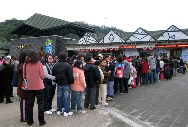 1月26日8时30分,赠台大熊猫“团团”“圆圆”在台北市动物园与台湾民众正式见面。众多台湾民众在动物园门口排队等候与“团团”“圆圆”见面。动物园规定,每日限定参观名额2.2万人次。(新华社记者王妍摄)