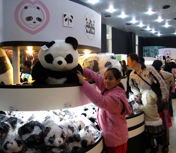 1月26日,参观完熊猫后的民众在选购纪念品。 当日8时30分,赠台大熊猫“团团”“圆圆”在台北市动物园与台湾民众正式见面。众多台湾民众在动物园门口排队等候与“团团”“圆圆”见面。台北市动物园规定,每日限定参观名额2.2万人次。(新华社记者王妍摄)