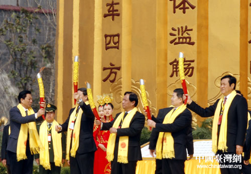 梁国扬等人引燃圣火火炬,向台港澳及海外华人代表分赠圣火。