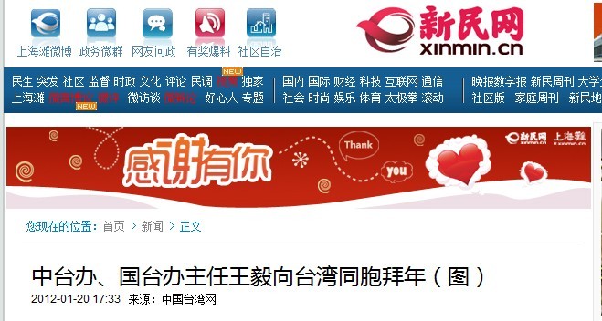 刚刚过去的2011年,是两岸关系承前启后,继往开来的重要一年。这一年里,在两岸同胞的共同努力下,两岸交往取得丰硕成果,两岸关系经受了严峻考验,两岸交流合作的基础更加牢固,两岸关系和平发展的前景更趋光明。在此,我谨向所有为此付出心血、做出贡献的台湾各界同胞致以最衷心的感谢!