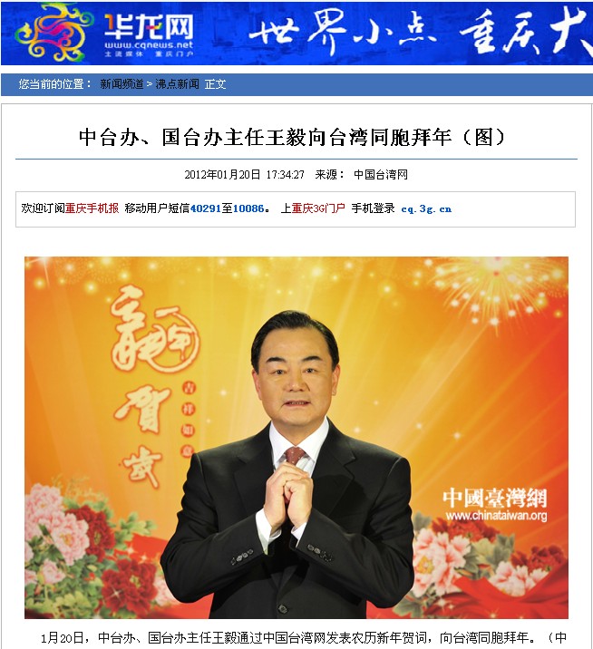 [华龙网] 中台办、国台办主任王毅向台湾同胞拜年