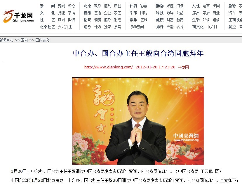 中国台湾网1月20日北京消息 中台办、国台办主任王毅20日通过中国台湾网发表农历新年贺词,向台湾同胞拜年。全文如下:
