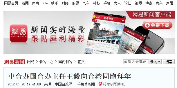 [网易] 中台办、国台办主任王毅向台湾同胞拜年(图)