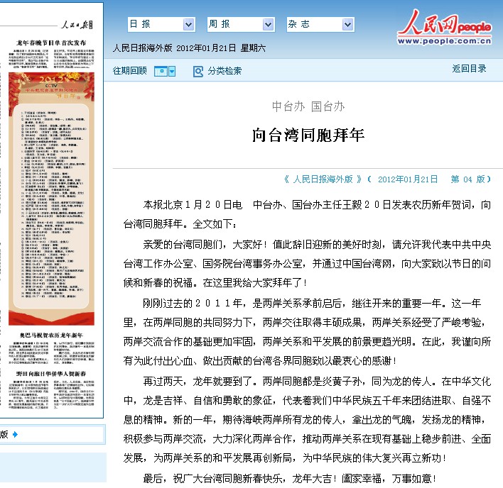 再过两天,龙年就要到了。两岸同胞都是炎黄子孙,同为龙的传人。在中华文化中,龙是吉祥、自信和勇敢的象征,代表着我们中华民族五千年来团结进取、自强不息的精神。新的一年,期待海峡两岸所有龙的传人,拿出龙的气魄,发扬龙的精神,积极参与两岸交流,大力深化两岸合作,推动两岸关系在现有基础上稳步前进、全面发展,为两岸关系的和平发展再创新局,为中华民族的伟大复兴再立新功!