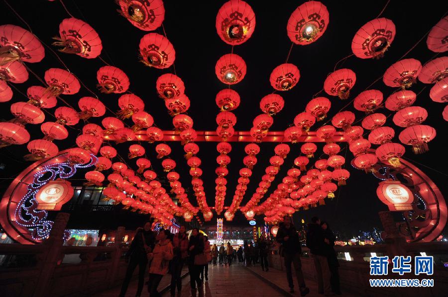 1月19日,游人在南京夫子庙景区观灯。当晚,2012年南京秦淮灯会亮灯,南京中华门城堡及明城墙、十里秦淮两岸、夫子庙地区等灯会展区的100多组大中型灯组、40多万盏花灯将整个夫子庙——秦淮风光带装扮成灯的海洋,再现了“秦淮灯火甲天下”的盛世美景。新华社记者 韩瑜庆 摄